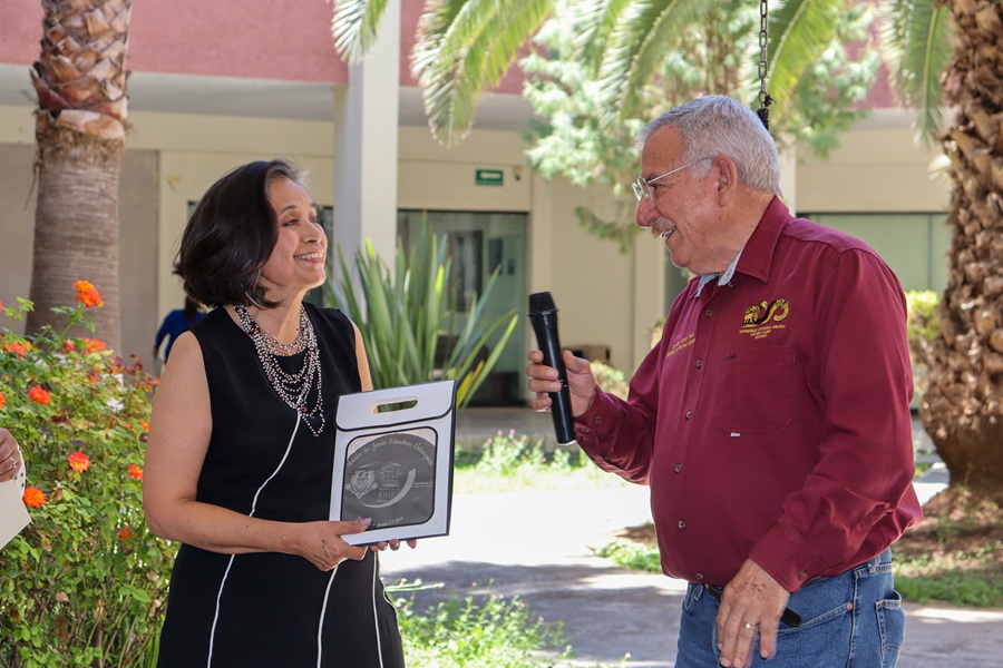 Durante el evento, también se le entregó un reconocimiento por sus años de servicio, destacando su entrega y aportaciones a la vida académica de la Universidad Autónoma Agraria Antonio Narro.
